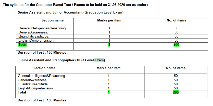 The syllabus for the Computer Based Test / Exams to beheld on 31.08.2020 are as under