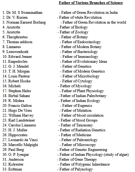 जीव विज्ञान की प्रमुख शाखाओं के जनक | Father of major branches of science pdf