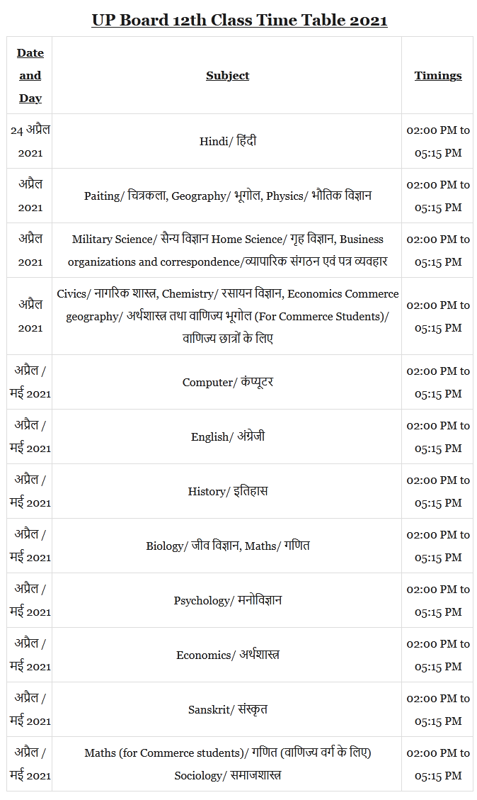 UP Board Time Table 2021