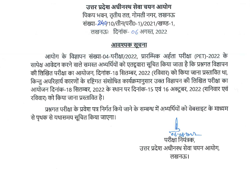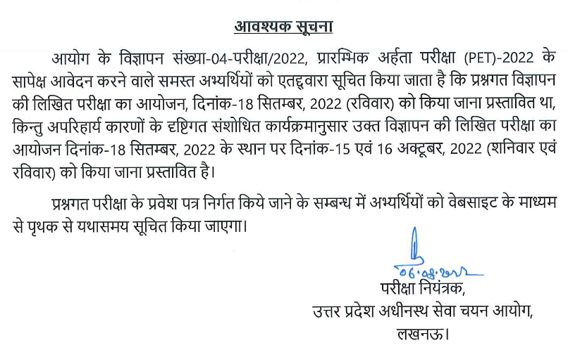 UPSSSC ने UP PET परीक्षा तिथि बदल दी है। यूपी पीईटी परीक्षा जो 18 सितंबर 2022 को होनी थी, अब 15, 16 अक्टूबर 2022 को होगी।