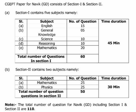 ऑनलाइन सीबीटी मोड के साथ भारतीय तटरक्षक नाविक जीडी की परीक्षा होगी। खंड-I में 60 प्रश्न हैं और 45 मिनट का आवंटित समय है और खंड- II में 50 प्रश्न होंगे और समय 30 मिनट का होगा। इस पृष्ठ में जीडी का विस्तृत पाठ्यक्रम नीचे दिया गया है।